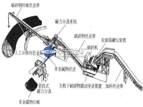 整條生產(chǎn)線由進(jìn)料輸送機(jī)、破碎機(jī)主機(jī)、出料輸送機(jī)、磁選輸送機(jī)、分料輸送機(jī)、除塵、操作柜組成。從金屬破碎機(jī)出來(lái)的破碎物,經(jīng)過(guò)皮帶輸送機(jī)、磁力分選系統(tǒng),把鐵金屬物和有色金屬物和非金屬物分離開,并由各自輸送機(jī)送出歸堆。有色金屬和非金屬物在輸送機(jī)上會(huì)再次受到磁選設(shè)備的搜索,把游離鐵金屬物揀出,從而提高鐵金屬物的回收率,同時(shí)通過(guò)人工挑選有色金屬,可提高回收效益。